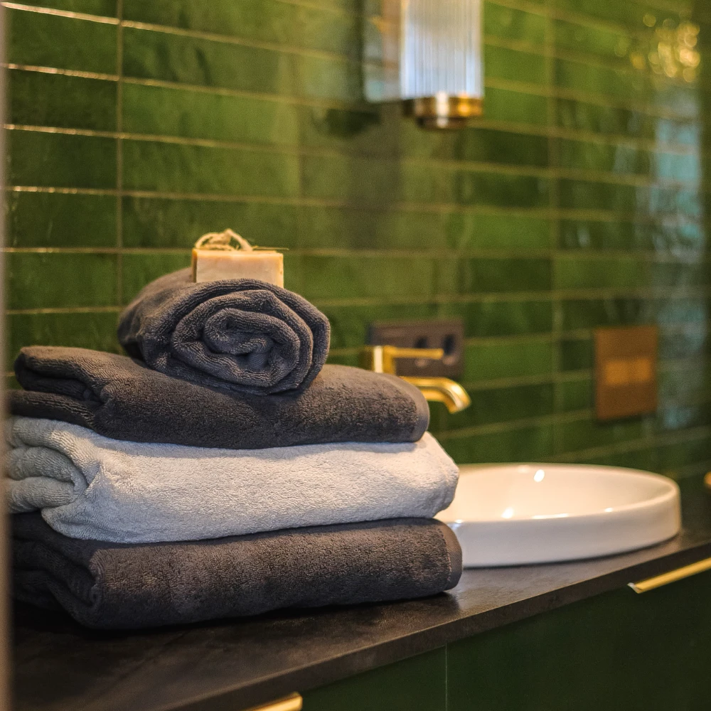 Ručníky vynikají svou odolnou strukturou. Tkaní dvou přízí dohromady vytváří silnější látku, která účinně absorbuje vlhkost, a přitom zůstává příjemně měkká na dotek.